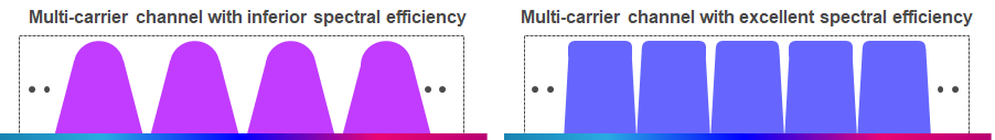Still, there are degrees of how well this can be performed. Figure 2 shows examples of submarine single multi-carrier channels comparing inferior and excellent spectral efficiency. Inferior spectral efficiency is characterized by wavelengths with rounded roll offs and poor use of their allocated spectral width. In contrast, excellent spectral efficiency features wavelengths with sharp spectral roll offs that nearly occupy all of their assigned spectrum, leaving almost no unused “white space” in the multi-carrier channel. The extra energy in a sharper-shaped spectrum means a higher signal to noise ratio, which can translate to more data being transmitted (higher modulation order) with the same BER.